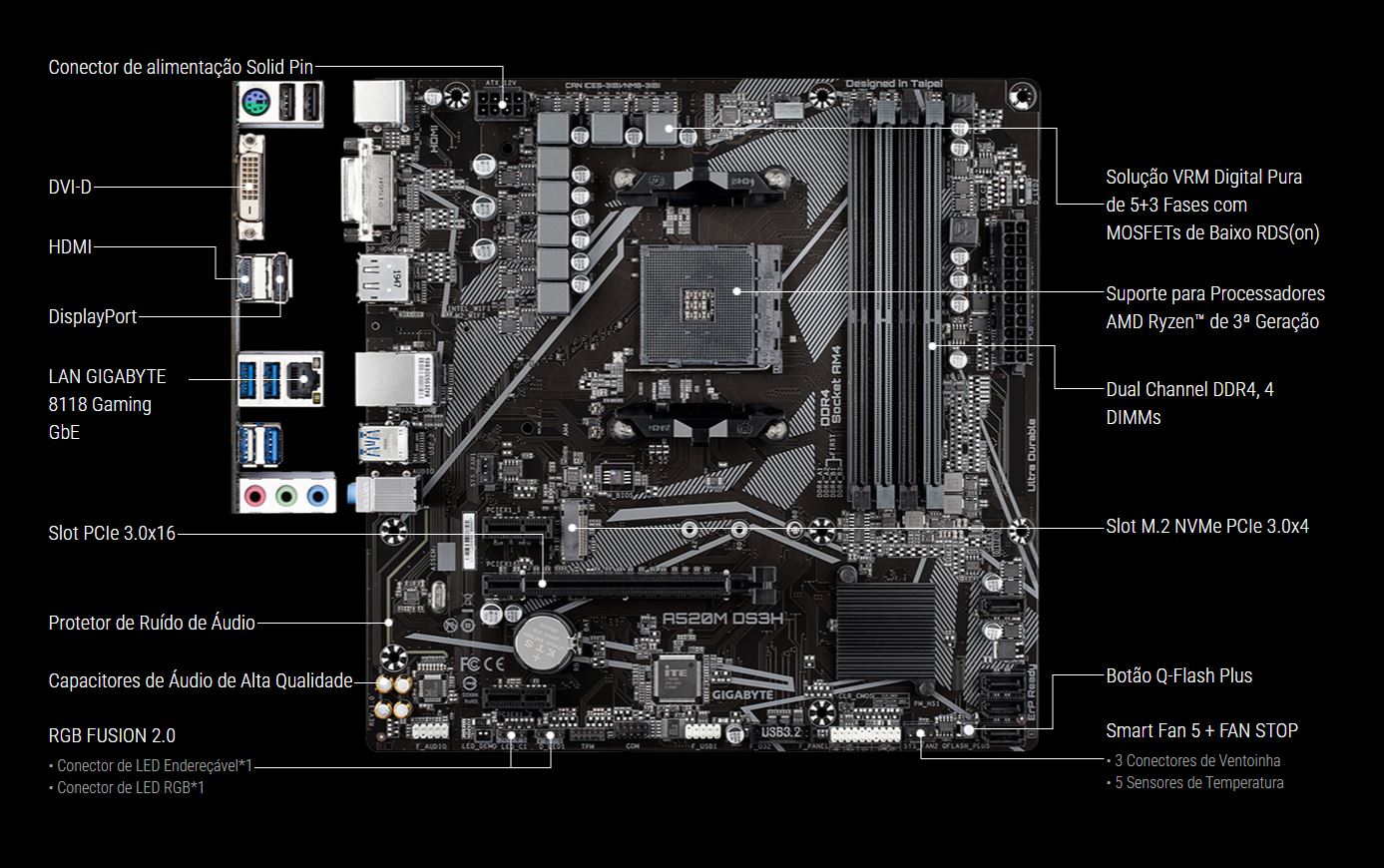 - Suporta Processadores AMD Ryzen™ Série 5000/ Ryzen™ Série 5000 G/ Ryzen™ Série 4000 G e Ryzen™ - Série 3000 e Ryzen™ Série 3000 G